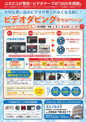 ビデオダビングキャンペーン始まりました!(~令和8年2月28日) 2026/01/20 こんにちは。ミズノカメラです。 土曜日に新聞折込しましたが、こちらでもご案内します。 『ビデオダビングキャンペーン』を開始しました。 VHS・VHS-C・8mm・Hi-8・MiniDV・カセットテープの5種類が対象です。 補修料金が込みのとってもお得になるキャンペーンです。 受付期間は令和8年2月28日(土)まで その他のダビングも対応していますので、気軽にお問合せください。 ミズノカメラ 0584-78-2217 お知らせ キャンペーン 8mmBetaHi-8MDMiniDVS-VHSVHSVHS-Cお得カセットテープカメラキャンペーンダビングビデオ大垣安い岐阜 おすすめ関連記事 ビデオダビングキャンペーン始まりました!(~令和3年11月21日) 今年もビデオダビングキャンペーン始まりました!(~令和4年12月18日) 七五三予約会開催のご案内 ビデオ変換ダウンロードサービス始めます。 ツイート シェア Google+1 はてブ pocket LINE